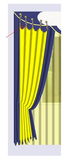 Объясню расположение по слоям, так думаю будет понятнее. Окно-Тюль-Тёмно синяя штора-Жёлтая штора-С помощью полигонального ламбрекена получается вид провисших складок, окрашиваем его в цвет т/синей шторы; добавляем шнур-Лепим бандо по модели, добавляем люверсы-Добавляем шнур длиной от отверстия к желтой шторе.