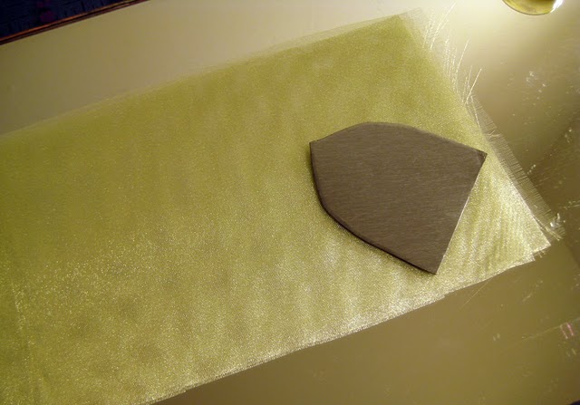 - Положите на стекло, на два слоя зеленой органзы шаблон лепестка меньшего размера.