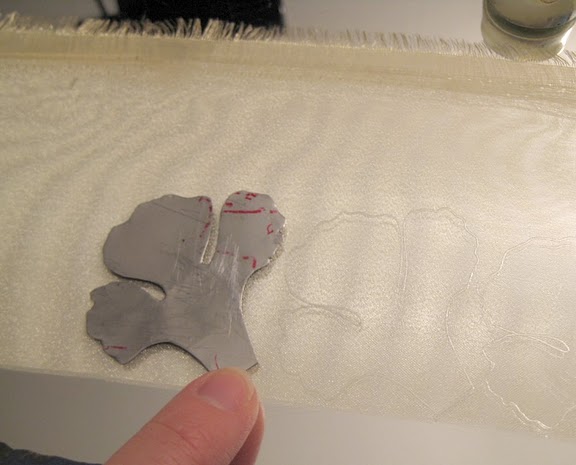 - Положите на стекло на один слой органзы шаблон лепестка. Вырежете паяльником верх лепестка, придерживая шаблон у основания, низ лепестка, придерживая шаблон сверху.
