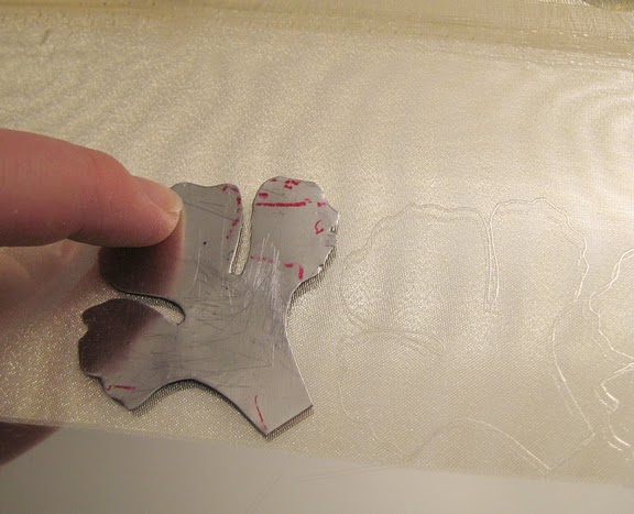 - Положите на стекло на один слой органзы шаблон лепестка. Вырежете паяльником верх лепестка, придерживая шаблон у основания, низ лепестка, придерживая шаблон сверху.