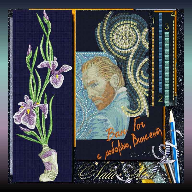 Композиция состоит из: портрета и фрагмента из картины «Звездная ночь», надписи «Ван Гог. С любовью, Винсент» на русском и английском, мазков – полосок - 4 видов, 2 кисточек. Автор Nata-Xa. Приобрести дизайн можно здесь https://new-embroidery.com/forum/index.php?topic=3087.msg508786#msg508786